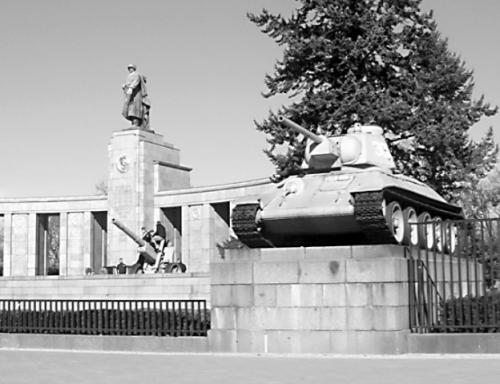 据报道,柏林目前有多处苏联红军纪念碑。这些纪念碑是为了纪念柏林战役中牺牲的30多万苏军将士。其中最大的一座苏军纪念碑建在柏林交通要道“6·17”大街上,勃兰登堡门就位于其斜对面。纪念碑顶是30米高的苏联战士塑像,主碑两侧各有一门野战大炮和一辆坦克(如图),当年苏军用这些武器攻下了柏林。