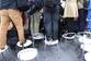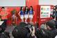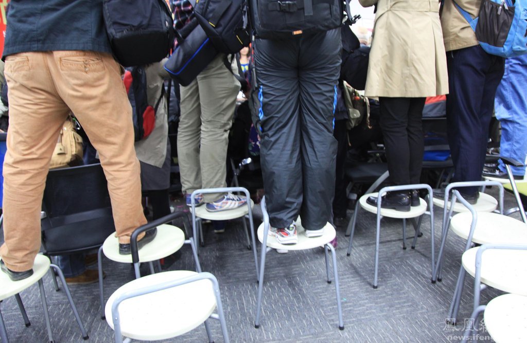 2015年04月12日,江苏省南京市,当日在新街口一电器大卖场,一场和摄影相关的展览讲座活动吸引了很多摄影爱好者,在组织拍摄时,因为场地太小,三名足球宝贝美女被围堵在主席台拍摄,有些后排的摄影师拍不到,干脆穿着鞋就踩站在凳子上拍摄,全然不顾自身形象。有人为了站稳还脚踩两只凳子。