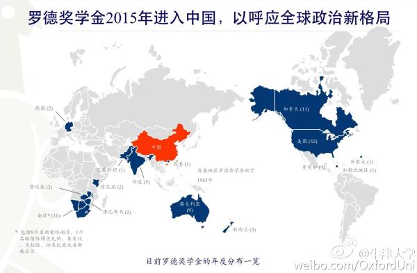 目前,罗德奖学金在全球已经扩展到美国、德国、澳大利亚、南非、巴基斯坦、牙买加、印度、中国香港等三十多个国家和地区,中国是罗德奖学金第二个“世纪计划”的首个国家。