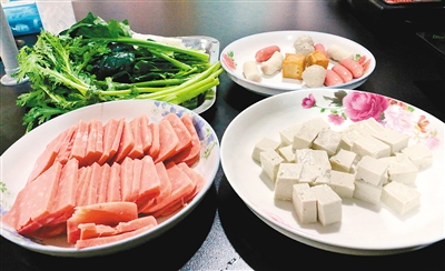 记者准备了午餐肉、香肠、菠菜、豆腐、茼蒿等人们日常吃火锅时的一些必备菜,并将午餐肉、香肠这些加工肉类及蔬菜,分别放入两个火锅当中,其中A锅以加工肉制品为主,B锅以蔬菜为主。