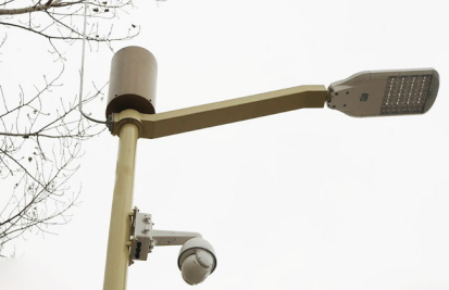路灯最顶部是WIFI信号收发器,可提供免费上网服务;向下是照明路灯,可根据交通流量和特殊天气调节光照度;再向下为监控探头,可对设备设施、社区道路进行实时监控;