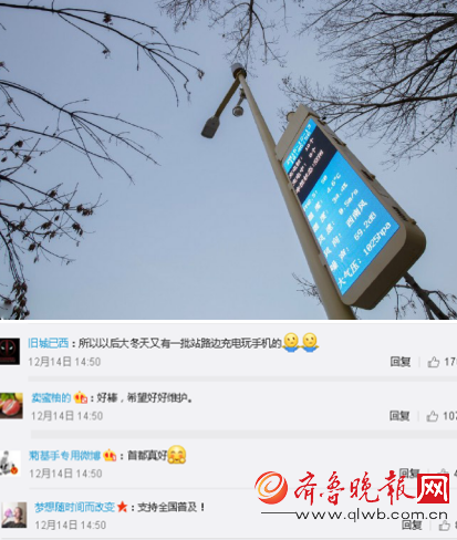 齐鲁晚报12月28日讯:近日,20座“高大上”的复合型路灯杆在北京左安门西街亮相。这些路灯杆不仅能照明,还能给电动车充电、为手机连接WIFI、监控道路视频信息、监测PM2.5、发布温度风速气压等信息……消息一经发布就引起了诸多网友们的热议,大家纷纷为此便民举措点赞。