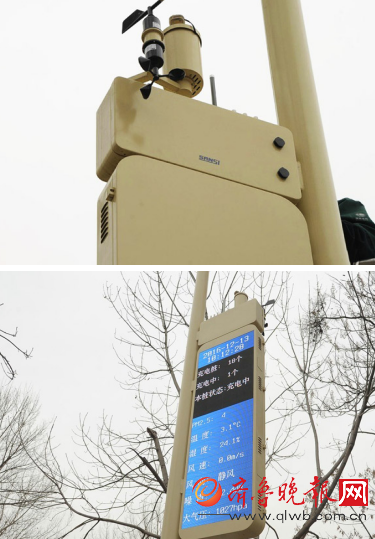 再往下是电子显示屏和环境传感器,可通过传感器监测PM2.5、温度、湿度、大气压、风速、风向等环境信息并在显示屏上实时发布,为市民出行提供方便;
