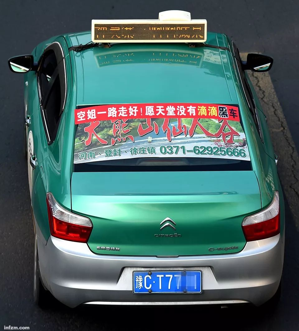 ▲2018年5月16日,河南洛阳街头,不少出租车司机自己掏钱印制标语,贴在车后窗上,以悼念遇害空姐。(东方IC/图)