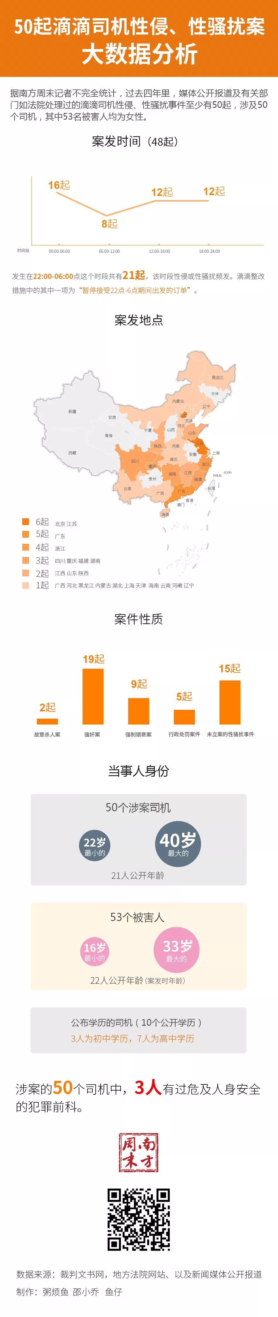 50个案例中,有2起故意杀人案,有19起强奸案、9起强制猥亵案、5起行政处罚案件、15起未立案的性骚扰事件;涉及50个司机,53名被害人均为女性。
