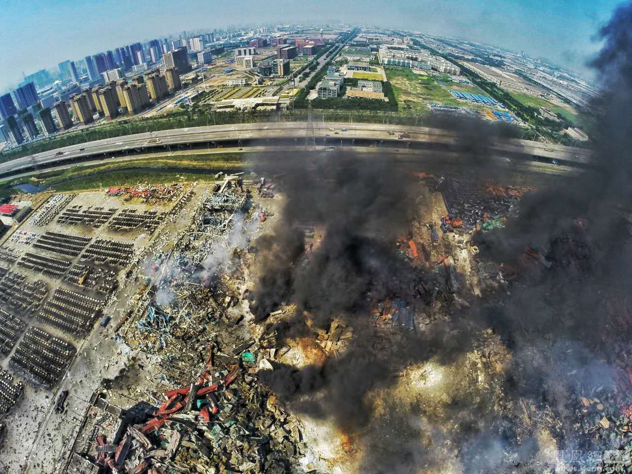 8月12日晚11时许,天津港国际物流中心区域内瑞海公司所属危险品仓库发生爆炸,截至8月13日中午12时,已造成44人死亡,其中包括12名消防官兵,住院治疗520人,其中重症伤员66人。图为航拍爆炸现场。图/付丁 法制晚报