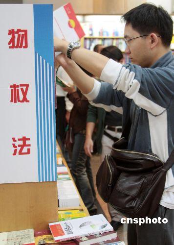 资料图:2007年10月1日,《物权法》实施,北京市民利用黄金周休息,纷纷来到书店《物权法》专柜进行翻阅或购买,及时了解与自己切身利益的有关的法律条文。 中新社发 吴芒子 摄