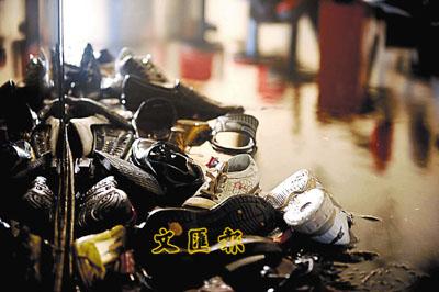 舞王特大火灾发生后,地上满是逃生人群踩踏耍落的鞋。