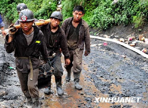 6月22日,几位矿工在运送抢险救援设备。当日,贵州省黔西南州晴隆县新桥煤矿透水事故抢险救援工作仍在进行中,被困井下矿工仍无消息。6月17日,新桥煤矿发生透水事故,16人被困井下。新华社记者 杨俊江 摄