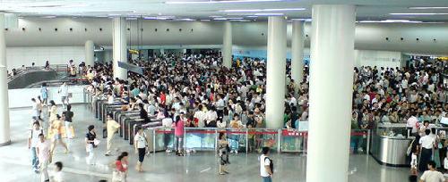 2009年7月15日早高峰(8:20)上海地铁2号线故障,导致大量从8号线、1号线转乘2号线旅客滞留。地铁工作人员在通往2号线的通道处拉起隔离线。部分旅客退票,大量上班族滞留等待。
