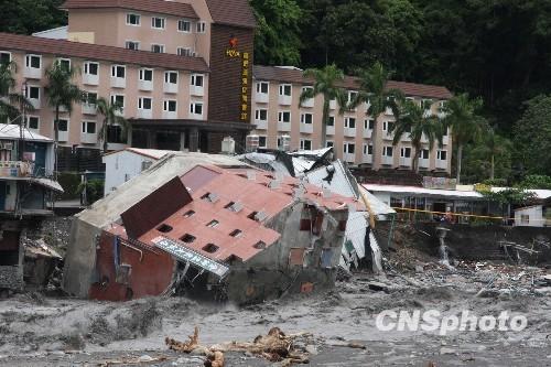 8月10日,业已轰然倒塌的台东知本温泉区六层金帅饭店,随着天气转晴、洪水退潮,裸露于溪中,现场令人惨不忍睹。“莫拉克”台风带来惊人豪雨,重创台湾东部、南部、中部部分地区,造成重大人员伤亡及财产损失。 中新社发 董会峰 摄