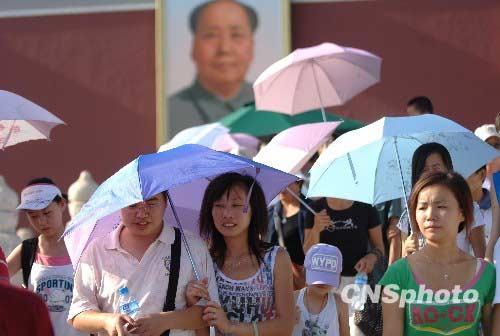 8月11日,在北京天安门地区参观的游客纷纷撑伞遮挡强烈的阳光。