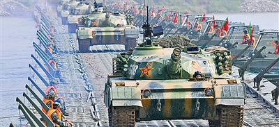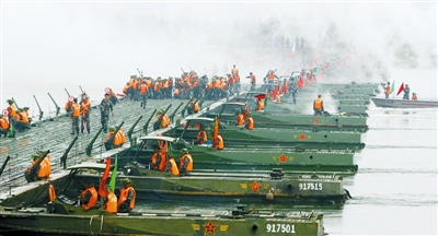 300多米宽的河面上,浪遏飞舟,水花四溅。3艘汽艇顶推锚定门桥展开作业。渡场下游千余米岸滩处,几十辆舟车依次泛水,激起一丈多高的浪花。身着橘红色救生衣的舟桥兵娴熟地将河中舟结合成一个个门桥单元。随后,在汽艇牵引下,迅速连接成一条钢铁浮桥,横跨黄河两岸。随即,两发红色信号弹划破天空,隐蔽在黄河北岸的装甲、炮兵、工程车辆,冒着炮火驶上浮桥,滚滚铁流跨越黄河天堑。