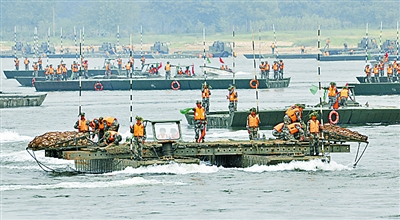 8月18日上午,黄河孟津段水域阴云密布,波涛汹涌。导演部一声令下,整装待发的济南军区某舟桥团闻令而动,渡河工程保障演练在黄河白鹤渡口拉开了战幕。