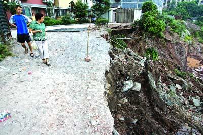 昨日,沙坪坝区石小路64号附1号,小区后方的边坡及围墙已经坍塌,居民小心地从旁边走过 记者 梁杰 摄