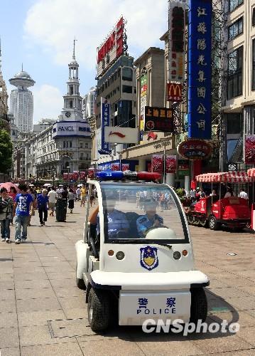 9月13日,上海一女警察开着一款轻巧、新颖的巡逻车,在街头执勤,让路人感到温馨、祥和的治安氛围。中新社发 潘索菲 摄