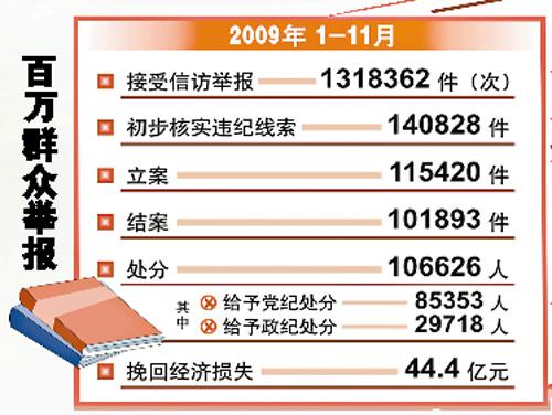 干以胜总结了2009年度办案特点,“办案工作力度明显加大”。据统计,1月~11月,纪检监察机关初步核实违纪线索数增长4.7%,立案件数增长4.5%,处分人数增长2.5%,移送司法机关人数增长16.6%。各级纪检监察机关处分县处级以上干部人数增长10.8%,处分贪污贿赂金额在100万元以上的干部人数增长19.2%。