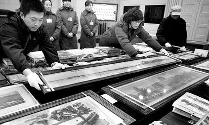 工作人员正在摆放颐和园百年老照片 摄/记者田宝希