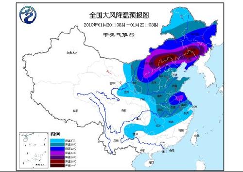 20日08时至22日08时,西北地区东部、内蒙古大部、华北、东北、黄淮、江淮、江汉、江南北部、贵州等地自西向东、自北向南将先后有5~6级、阵风7~8级偏北风;上述地区的气温将下降8~12℃,其中,内蒙古中东部、华北北部、东北地区中南部降温幅度可达14~16℃,内蒙古中部和东部偏南地区、东北地区中部的部分地区降温达18~20℃。21日早晨,内蒙古东北部、东北地区北部的最低气温将下降到零下30至零下35℃,局地达零下40℃。