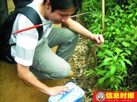 动物专家在现场抓住了一条“短尾蝮”蛇带走检验。