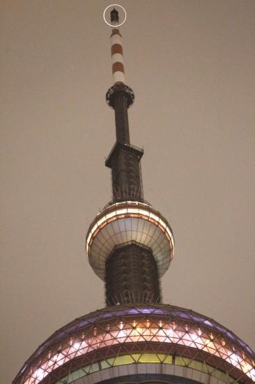 圆环标注处即为东方明珠塔起火部位(4月13日摄)。