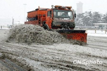 2010年1月3日,北京降下了今年首场大到暴雪。市政、环卫采用推雪、铲雪、撒融雪剂等多种方法保畅通。当日降雪是30多年来最大雪,全市普遍达到6-8毫米,其中居庸关降雪最大。据市政管委会统计,截止当日17:00为止,全市包括郊区县,除雪工作共用去融雪剂15710吨,动用专业人员49824人次,出动专业车次5909车次。中新社发张郎 摄