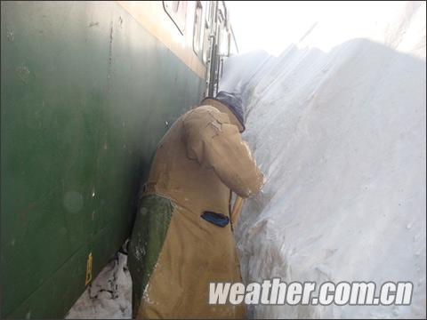 4日,救援人员在清除车厢一侧的积雪(来源:商都县气象局)