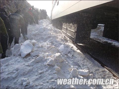 这趟由哈尔滨开往包头的列车曾于3日21时左右在商都县18公里七台镇大东沟处因暴雪受阻,15节车厢上的1400多名旅客和乘务人员全部被困。在某些地段,堆起的积雪比车厢还高出几米,半截车厢被埋,前去救援的轨道车也被积雪所困。
