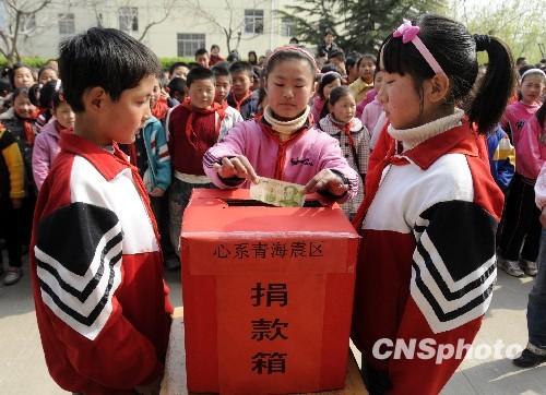 4月16日,山东省枣庄市凫城乡中心小学学生将自己的零花钱投进捐款箱。中新社发 李宗宪 摄