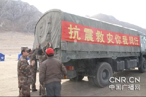 车队15日从西宁出发,路程有800多公里,路况不是很好。为了确保救灾物资能够平安抵达震区,官兵们把车速放慢来确保物资完好。直到16日凌晨4点,车队才在一个小镇休息了两个小时——在接到命令的48个小时里,官兵们平均休息都不到5个小时。如果开车的战士饿了,就换另一人开,换下来的人休息、吃点方便面,平均每辆车都有3个战士,可以应付各种突发情况。一路上,一些战士高原反应严重——尤其是车队翻越巴彦克拉山时,气温很低,车窗上结了一层冰;而且在翻山的时候战士们的高原反应更严重。大家吃药并轮流休息,以确保运输队能够尽快到达灾区。