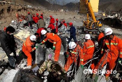 4月16日,兰州军区救援队在玉树县城正全力搜救倒塌房屋下的幸存者,各救援点展开了拉网式搜救。中新社发刘应华 李欧 摄