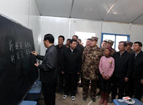 4月18日,中共中央总书记、国家主席、中央军委主席胡锦涛在青海玉树地震灾区指导抗震救灾工作。这是胡锦涛在玉树州孤儿学校看望震后复课的学生,勉励他们努力学习,长大以后成为对国家、对人民有用的人才,并在黑板上用力写下“新校园,会有的!新家园,会有的!”。新华社记者兰红光摄