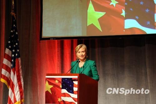 当地时间9月10日晚,美国国务卿希拉里在华盛顿出席美国对华友好团体为欢迎中国全国人大常委会委员长吴邦国访美举行的晚宴,并在晚宴上致辞称,奥巴马将于今年11月访华,建立密切美中关系是奥巴马政府的中心目标,也是她本人的工作重点。中新社发 李静 摄