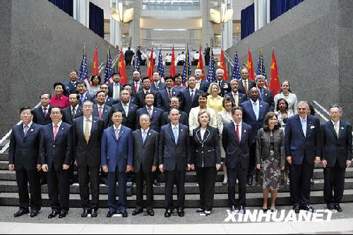 7月27日,中国国家主席胡锦涛特别代表、国务院副总理王岐山,国务委员戴秉国与美国总统奥巴马的特别代表、美国国务卿希拉里·克林顿和财政部长蒂莫西·盖特纳及与会官员在首轮中美战略与经济对话开幕前合影。当日,首轮中美战略与经济对话在美国华盛顿开幕。新华社记者张岩摄