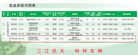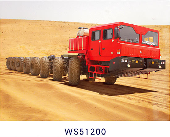 这就是中国三江航天集团作为民用车辆对外推广的WS51200型八轴超重型越野车。型号为WS51200,驱动形式16×12(六个驱动轴,两个从动轴),美国康明斯KTTA19-C700发动机,额定功率522kw,最大扭矩2731牛米,德国ZF WSK440+16S251自动变速箱,总质量122吨,整备质量42吨,装载质量80吨,车长20.11米,车宽3.35米,车高3.35米,轮胎直径1.6米。