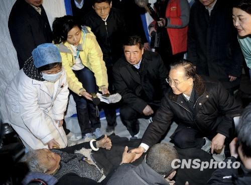 4月15日,中国国务院总理温家宝来到青海省玉树县玉树自治州医院看望受灾民众。这是温家宝握着一位藏族大妈的手问候其身体情况。 中新社发 廖攀 摄