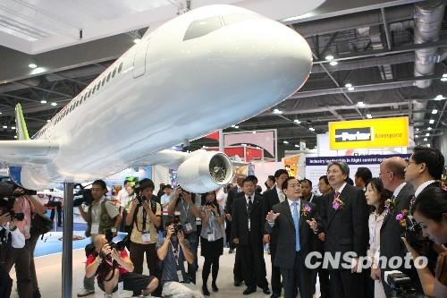 九月八日,首次参加亚洲国际航空展览的中国商用飞机公司,为本届“航展”带来了备受关注的C919大飞机一比二十体积的模型,机身外形设计首度亮相。图为中商飞公司总经理金壮龙,在展出现场向嘉宾介绍C919飞机。中新社发 郑祚声 摄