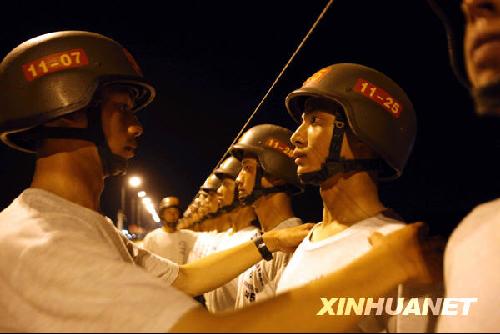 夜晚的沙河阅兵村,处处可见官兵刻苦训练的身影(7月2日摄)。新华社记者 王建民摄