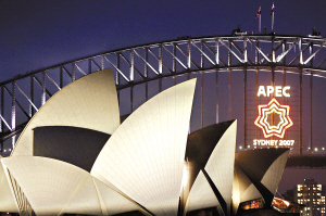 9月8日至9日,亚太经合组织(APEC)第十五次领导人非正式会议将在澳大利亚的悉尼召开。今年APEC会议的主题为“加强大家庭建设,共创可持续未来”。与会领导人或代表将重点讨论气候变化和清洁发展、区域经济一体化、支持多哈回合谈判、贸易投资自由化和便利化、APEC改革、新成员等议题。