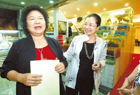 高雄市长陈菊10日过60大寿,9日晚间她的民间友人在台北一间海产店帮她预先暖寿庆生,晚宴前她向记者表示,她生日最大的愿望就是先办好即将在7月登场的高雄世运。民进党“立委”田秋蓳(右)也出席向她道贺,并夸赞她今天穿得很漂亮。(王锦河摄)