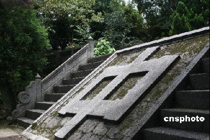 墓前斜坡上,用水泥雕成一个高大的“中”字。取意于阎锡山认为:处事、为人、为政,都要“发于仁,归于中”。 中新社发 耿军 摄
