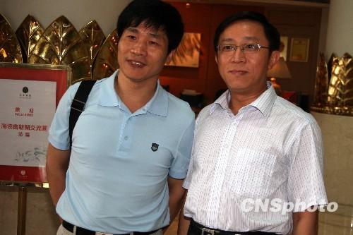7月27日下午,由海协会专家、国台办新闻局局长杨毅率领的“海协会新闻交流团”一行16人搭机抵台,将展开为期7天的访问、交流。图为杨毅(右)抵达下榻的台北亚太会馆。 中新社发 董会峰 摄