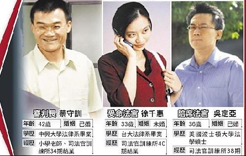 综合台湾媒体报道,审理扁家弊案的台北地方法院合议庭3位法官蔡守训、吴定亚和徐千惠,3人平均年龄才38岁,但这3位年轻司法悍将却以过人胆识和钢铁意志面对扁家世纪大案,不畏绿营压力将卸任领导人陈水扁判重罪。