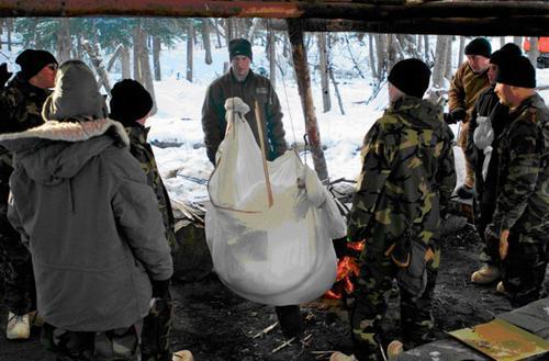 SERE课程中非常艰苦的一项内容就是在阿拉斯加地区进行极地耐寒训练。上图是一名SERE教官正在向学员们讲授各种聚集和融化雪水以供饮用的方法。(图片来源:美国空军图片库/蒂莫斯.汤普森)