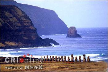 复活节岛位于太平洋东南部,属智利管辖,全岛发现1000多尊巨大的半身人面石像,其中600尊整齐地排列在海边,有些石像头上戴着红色石料制成的帽子。
