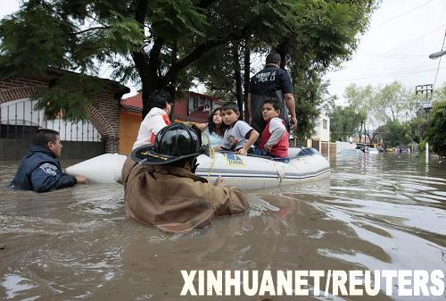 在墨西哥首都墨西哥城,灾民从遭受洪水袭击的街区撤离。新华社/路透