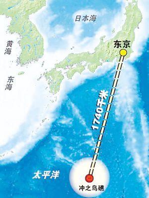 冲鸟礁位于日本以南1000多公里,退潮时东西长4.5公里、南北长1.7公里、周长11公里。涨潮时,冲鸟礁基本淹没在海水中,只有两块礁石露出水面,面积不到10平方米。
