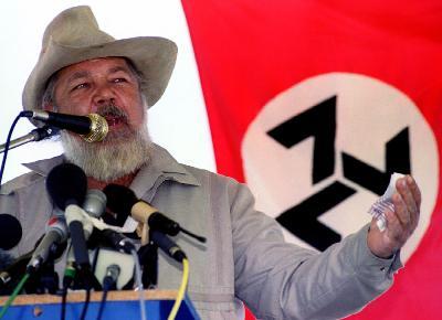 南非极右翼领袖尤金 特雷布兰奇。他身后是“南非白人抵抗运动”旗帜