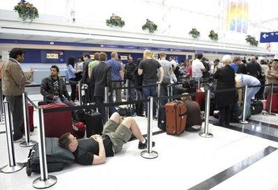由于火山灰云飘向欧洲,多国航空交通受阻,旅客排起长队