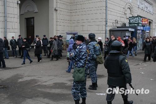 当地时间3月29日晨,莫斯科市中心的“卢比扬卡”地铁站和“文化公园”地铁站分别发生恐怖爆炸袭击事件。由于事发时正值上班高峰,导致人群大量拥堵,地面交通受到严重影响。图为莫斯科警方和特种部队士兵在发生爆炸的“文化公园”地铁站出口疏散乘客。 中新社发 田冰 摄